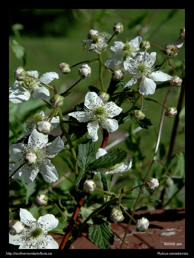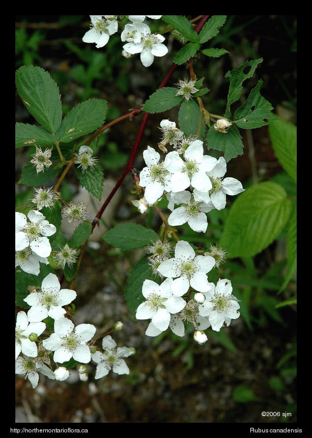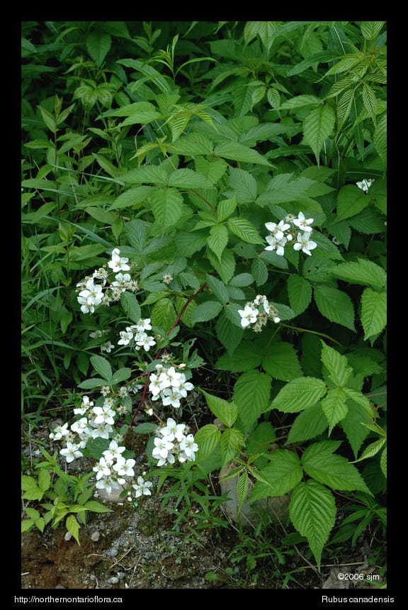 Habitat and Range: Thickets, forest edges and clearings, and open and disturbed habitats, such as abandoned fields, rights-of-way, and roadsides. The smooth blackberry has a northeastern North American range, and occurs throughout southern and eastern Ontario, extending northwest to the Wawa area, with a disjunct population at the lower end of Lake Nipigon (Soper & Heimburger 1982).
