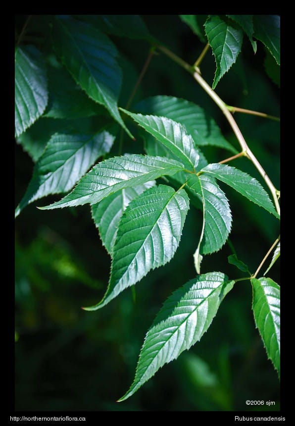 Leaves: Alternate, palmately compound, and stalked (petiolate). Vegetative canes (primocanes) have leaves with 5 leaflets; those of the second-year flowering canes (floricanes) have 3 leaflets or a reduced, simple, lanceolate leaf. Petioles are usually smooth (glabrous) or bear 1-2 scattered slender prickles. The terminal leaflet is ovate, 9-20 cm long and 4-5.5 cm wide and stalked, the petiolule 3-10 cm long; the base is rounded to cordate; the apex is long and narrowly pointed (attenuate to caudate). Lateral leaflets are lanceolate to ovate and smaller than the terminal leaflet; the middle pair of leaflets has shorter petiolules, while the lowest pair of leaflets is sessile or nearly so, with very short petiolules, <1-5 mm long. Leaflets are green and essentially glabrous on both surfaces; although a few scattered hairs may be present, especially on veins, the lower surface does not feel velvety; margins are sharply toothed (serrate) to often double-toothed (double-serrate). Leaves of the floricanes are smaller and have oblanceolate to obovate leaflets with tapering (cuneate) bases and pointed (acute or short-acuminate) apices.