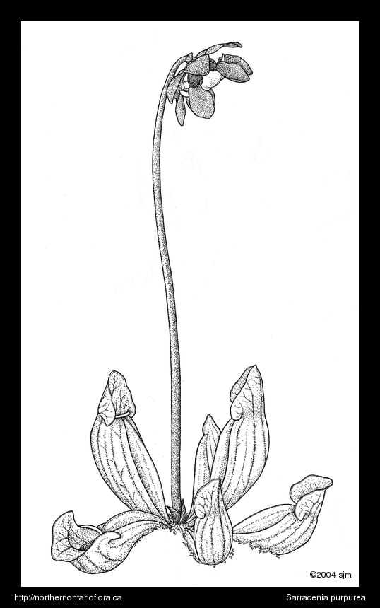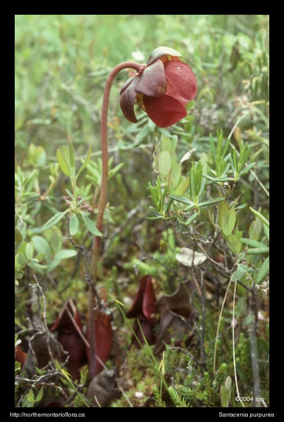 Habitat and Range: Sphagnum bogs, peaty hummocks in fens, and serpentine barrens. The pitcher plant occurs across Canada; its range extends throughout much of northern Ontario, as far north as the Fawn River, 54° 40' N (Scoggan 1978).