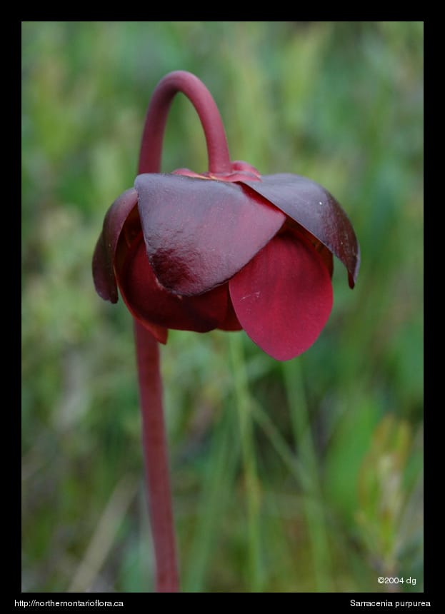 Click on a thumbnail below to see larger image.General: A perennial insectivorous forb, to 5 dm tall. Outer surface of leaves and flowering stalk (scape) smooth (glabrous). The pitcher plant is the provincial flower of Newfoundland and Labrador.