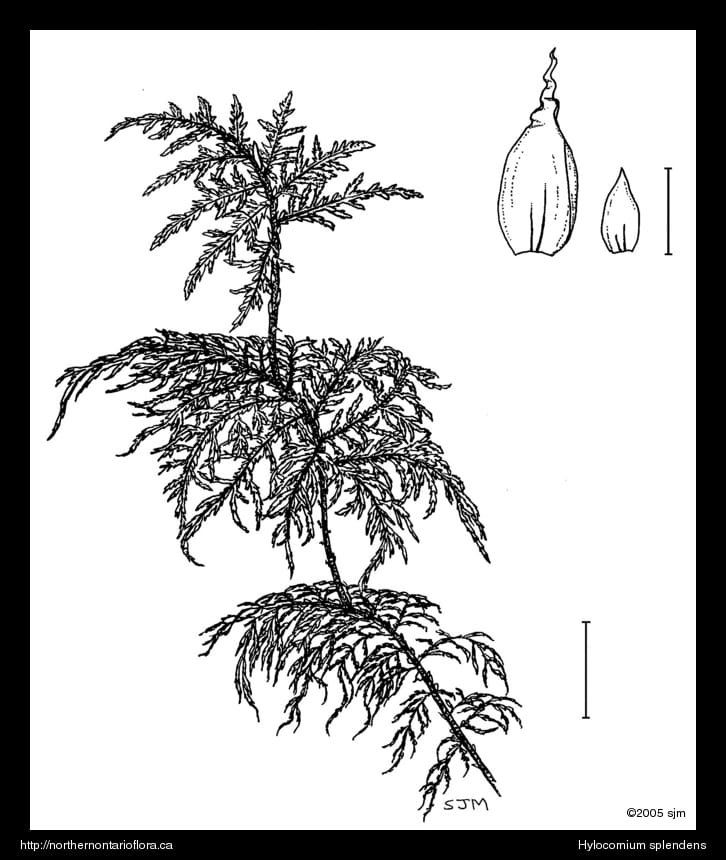 This excellent illustration of Hylocomium splendens is from the online version of the Bryophyte Flora of North America; it shows the various leaf sizes and one of the many paraphyllia that cover the stem.